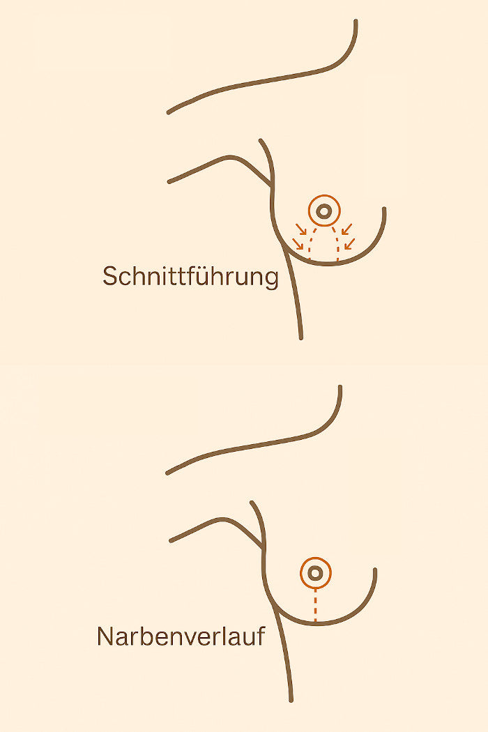 - Anker-Schnitt-Technik: Schnitt um den Warzenhof, senkrecht nach unten und in der Unterbrustfalte – für maximale Straffung bei stark erschlaffter Brust.